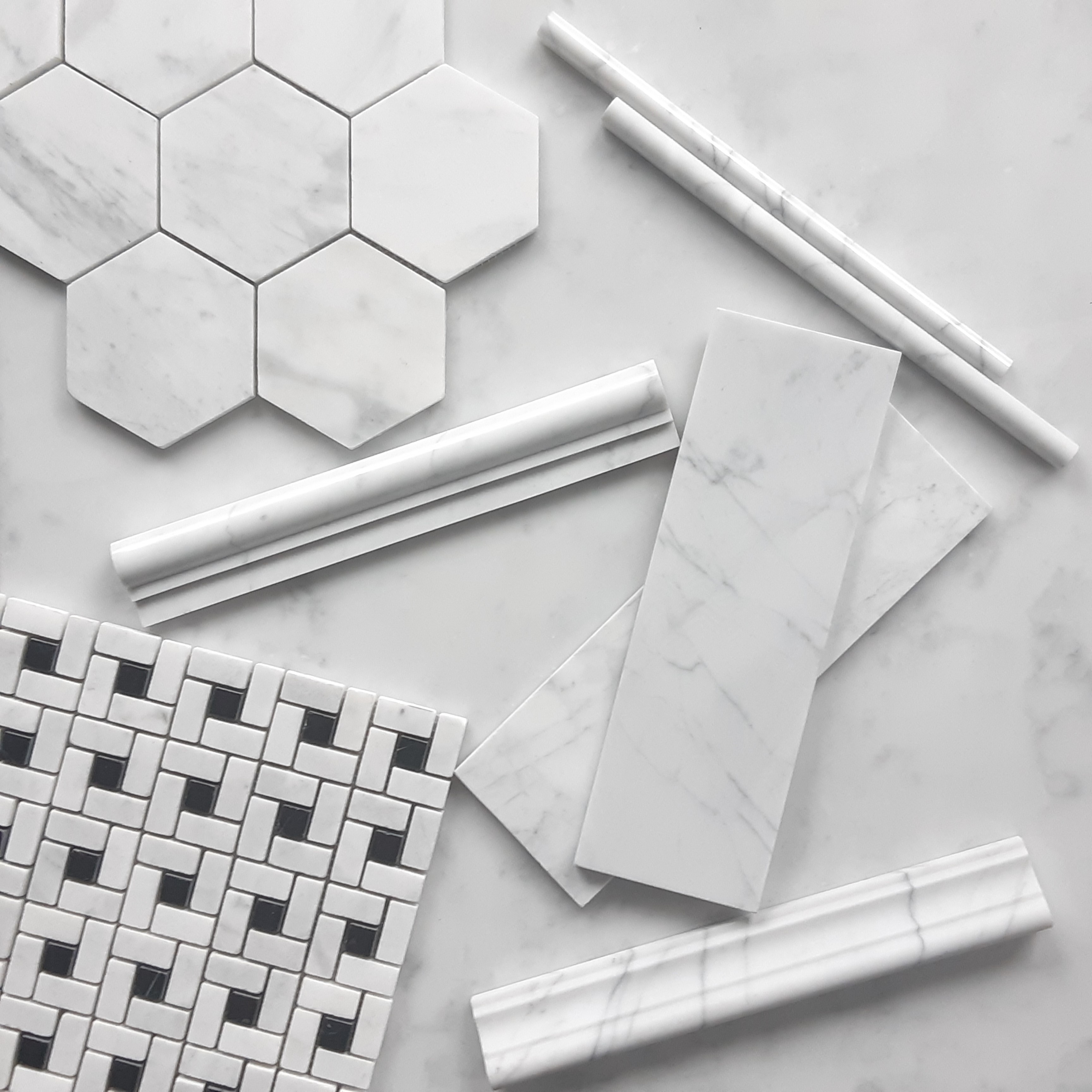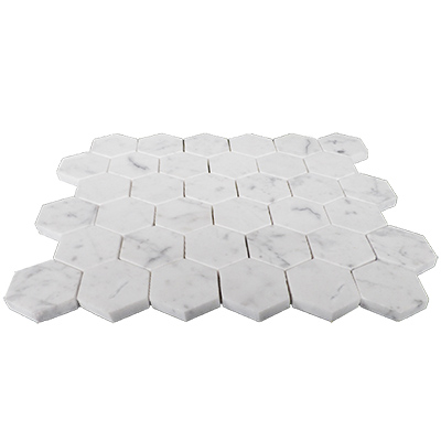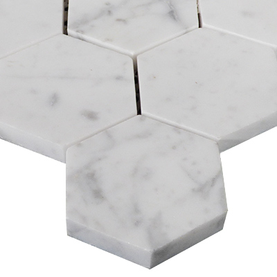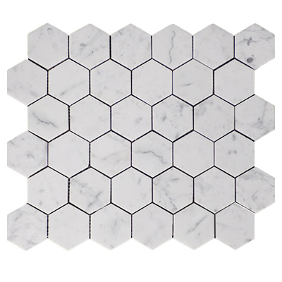 Carrara White Marble 2" Hexagon Mosaic Tile is also known as Bianco Carrera Marble 2 inch Hexagon (Honeycomb) Tile. Premium grade marble 2 inch hexagon tile is perfect for both residential and commercial projects. 2 inch Hexagon Tiles are mainly preferred as floor tiles for their clean, aesthetic qualities. A large selection of coordinating products are available, including Carrara basketweave mosaic tile, Carrara 1" hexagon mosaic tile, Carrara 2x4 subway mosaic tile, Carrara herringbone mosaic tile, Carrara bullnose pencil molding. Carrara White Italian Marble collection available in honed and polished finishes.