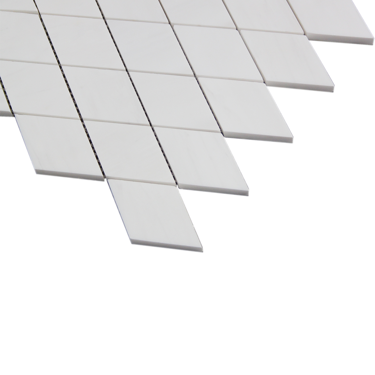 Bianco Dolomite Large Diamond Mosaic Tile also known as Dolomiti White Large Diamond Mosaic Marble. Available in honed, polished finishes. Premium grade (rhomboid) Large Diamond mosaic tile perfect for both residential and commercial projects. (rhomboid) Large Diamond Mosaic Tiles mainly preffered as floor tiles for its clean, aesthetic qualities. A large selection of coordinating products are available and includes Bianco Dolomite basketweave mosaics, Bianco Dolomite herringbone mosaics, Bianco Dolomite hexagon mosaics, 3x6 marble subway tiles, 12x12 Bianco Dolomite marble tiles, 4x4 Bianco Dolomite marble tiles, Bianco Dolomite Borders, Bianco Dolomite moldings and Bianco Dolomite Baseboards.
