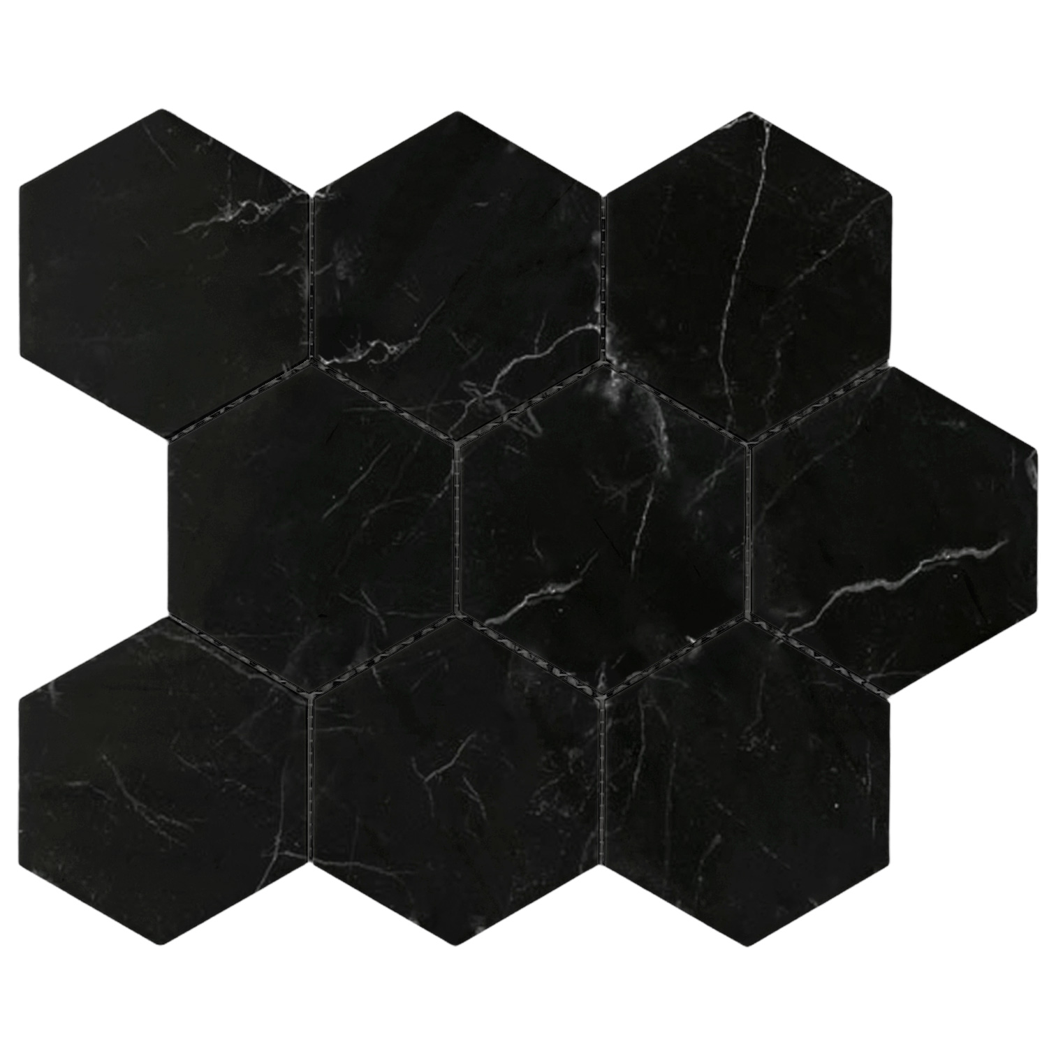 Premium Grade Nero Marquina Black Marble 4" Hexagon Mosaic Tile Honed