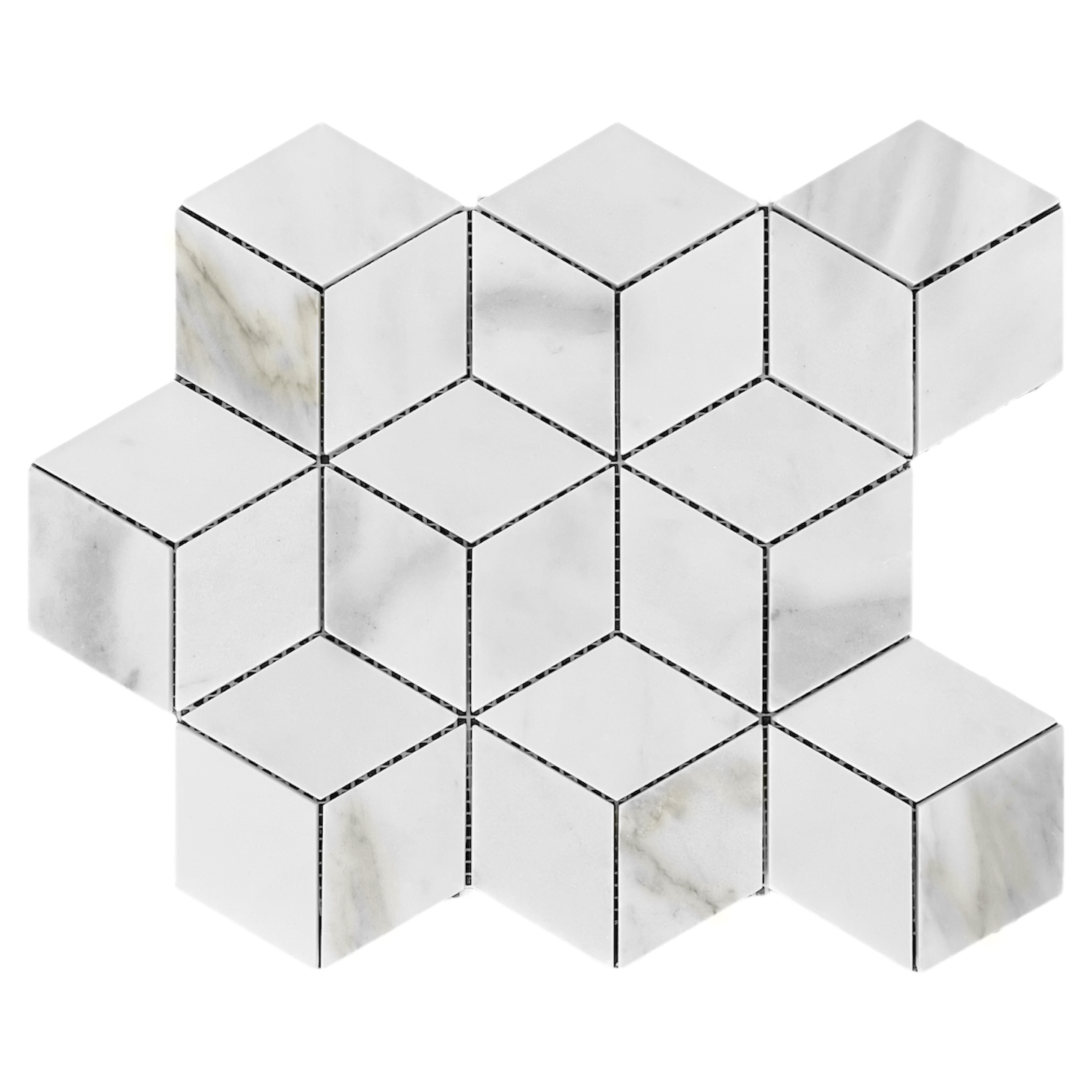 Calacatta Gold Marble Rhombus 3D Cube Diamond Mosaic Tiles available in Polished and Honed finishes. Uses include Kitchen Backsplash, Bathroom Wall, Floor Tiles, and Shower Mosaics. Sample Sale Price $4.95. First Quality Marble in Stock Ready to Ship. Free shipping continental USA. The same Day In-Store Pickup is available. Visit our showrooms for complimentary design ideas. Rhombus 3D mosaic is a tile perfect for both residential and commercial projects. Rhombus 3D Patterned Mosaic Tiles are mainly preferred as floor tiles for their clean and aesthetic qualities. A large selection of coordinating products are available, including Calacatta Gold basketweave mosaics, Calacatta Gold chevron mosaics, Calacatta Gold hexagon mosaics, 3x6 marble subway tiles, 12x12 Calacatta Gold marble tiles, 4x4 Calacatta Gold marble tiles, Calacatta Gold Borders, Calacatta Gold moldings and Calacatta Gold Baseboards.