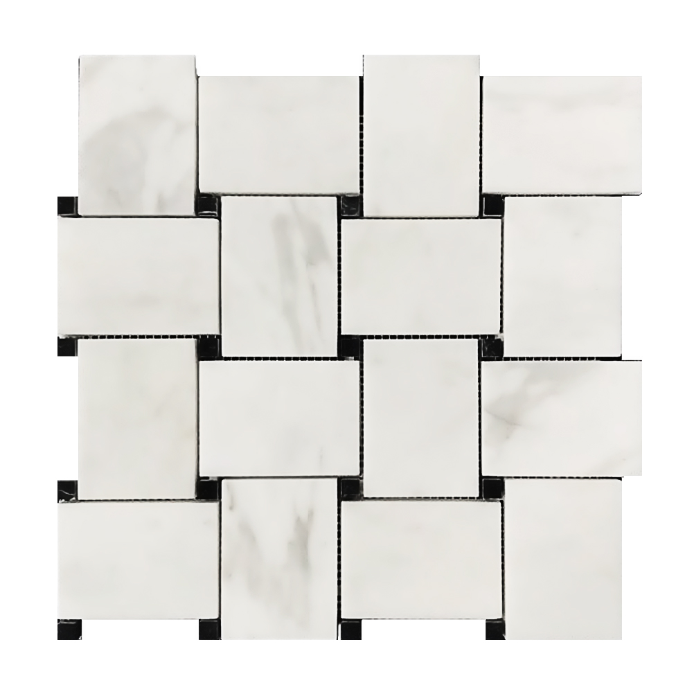 Calacatta Gold Marble Large Basketweave Mosaic Tile with Nero Marquina Black Dots, available in honed and polished finishes, premium grade Calacatta large basketweave mosaic tile perfect for both residential and commercial projects. Basketweave Mosaic Tiles mainly preferred as floor tiles for its clean, aesthetic qualities. A large selection of coordinating products are available and includes Calacatta 2x4 subway mosaic tile, Calacatta 1" hexagon mosaic tile, Calacatta 2" hexagon mosaic tile, Calacatta herringbone mosaic tile, Calacatta bullnose pencil molding in honed and polished finishes.