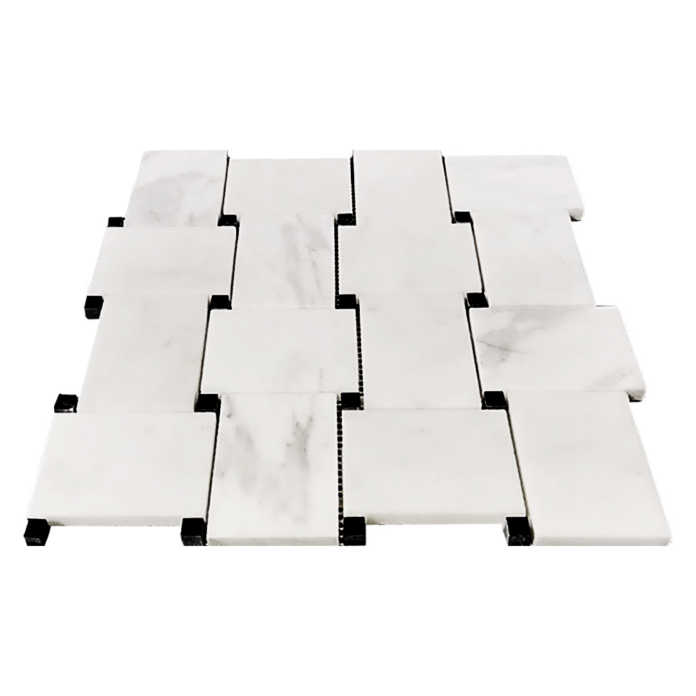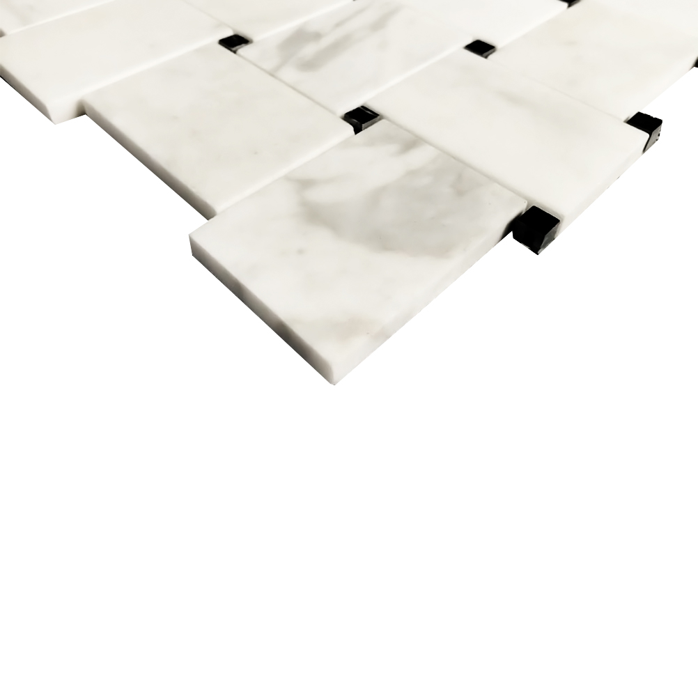 Calacatta Gold Italian Marble Large Basketweave Mosaic Tile with Nero Marquina Black Dots Polished