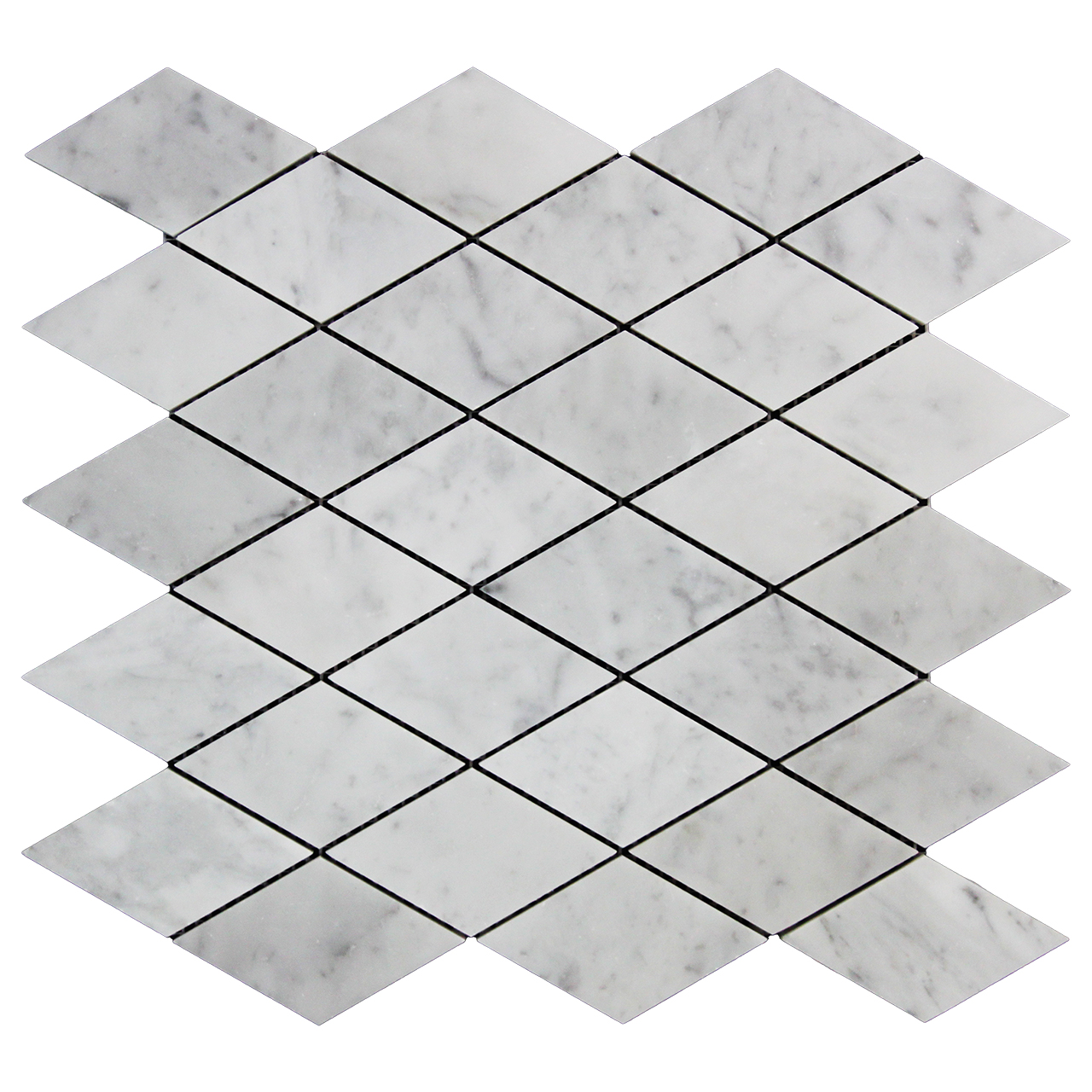 Carrara White Large Diamond Mosaic Tile also known as Carrera Gold Large Diamond Mosaic Marble. Available in honed, polished finishes. Premium grade (rhomboid) Large Diamond mosaic tile perfect for both residential and commercial projects. (rhomboid) Large Diamond Mosaic Tiles mainly preffered as floor tiles for its clean, aesthetic qualities. A large selection of coordinating products are available and includes Carrara White basketweave mosaics, Carrara herringbone mosaics, Carrara hexagon mosaics, 3x6 marble subway tiles, 12x12 Carrara marble tiles, 4x4 Carrara marble tiles, Carrara borders, Carrara moldings and Carrara baseboards.