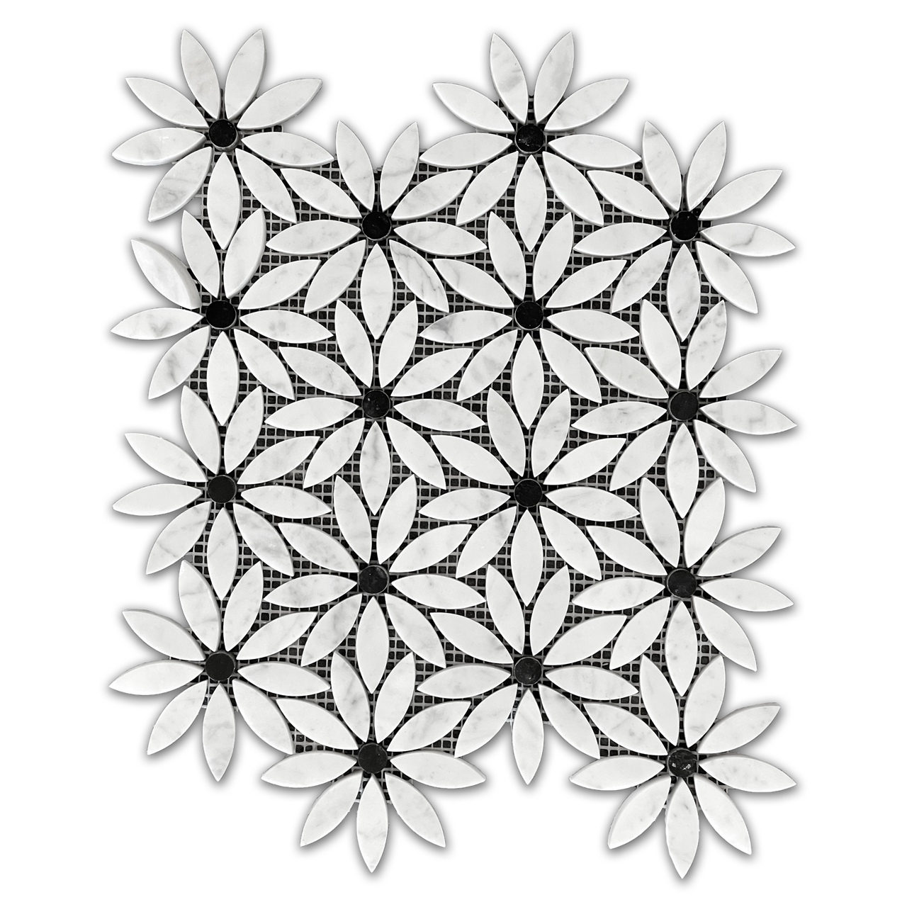 Carrara White with Nero Marquina Black Center Accent Daisy Flower Waterjet Mosaic Tile Matte Honed - Premium Grade Carrara White Italian Marble