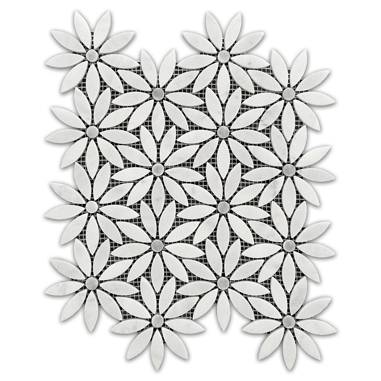 Carrara White Marble With Bardiglio Gray Accent Daisy Flower Waterjet Mosaic Tile Honed