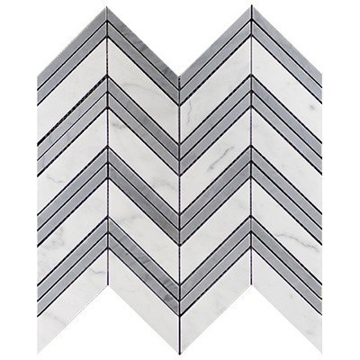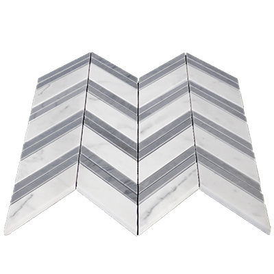 Bianco Carrara Chevron Mosaic Tile also known as White Carrera Chevron Mosaic Marble. Available in honed, polished and tumbled finishes, premium grade Chevron mosaic tile with Bardiglio Gray strips perfect for both residential and commercial projects. Chevron Mosaic Tiles mainly preffered as floor tiles for its clean, aesthetic qualities. A large selection of coordinating products are available and includes Carrara basketweave mosaics, Carrara herringbone mosaics, Carrara hexagon mosaics, 3x6 marble subway tiles, 12x12 Carrara marble tiles, 4x4 Carrara marble tiles, Carrara borders, Carrara moldings and Carrara baseboards.