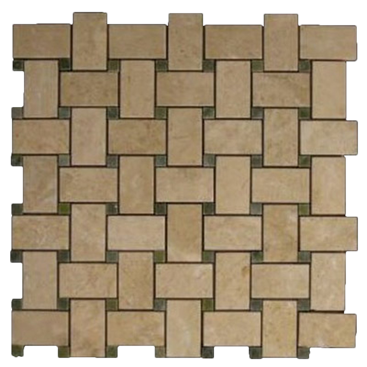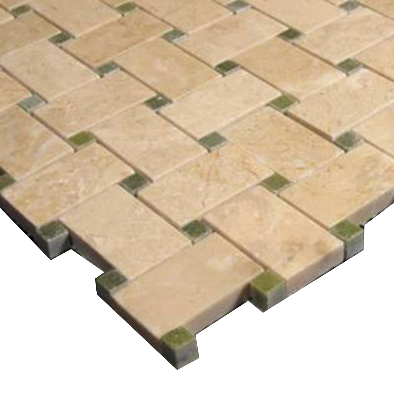 - Premium Grade Crema Marfil Marble Basketweave Mosaic Tile with Green Dots Polished - Stone Sizes per Piece: * Rectangle Pieces are 1 1/8” Wide and 2” Long * Square Pieces are 3/8” by 3/8” * Thickness is 3/8" - Product has a Polished finish. - Grout Width is 1/16" - There are 7 rows and 7 columns on each sheet, with 98 stones per sheet. - Mosaic is mounted on one square foot of sturdy mesh to facilitate installation. - Carefully selected; consistent in size and finish. - Large quantities are in stock and readily available in both full pallets and containers. - Perfect for use in commercial and residential projects.
