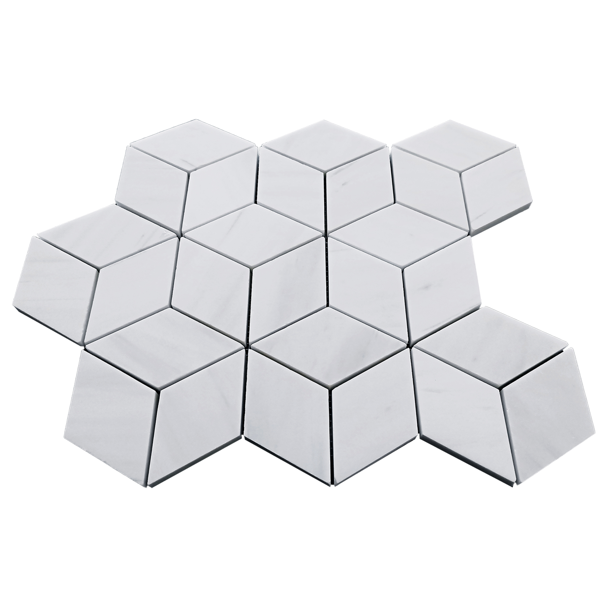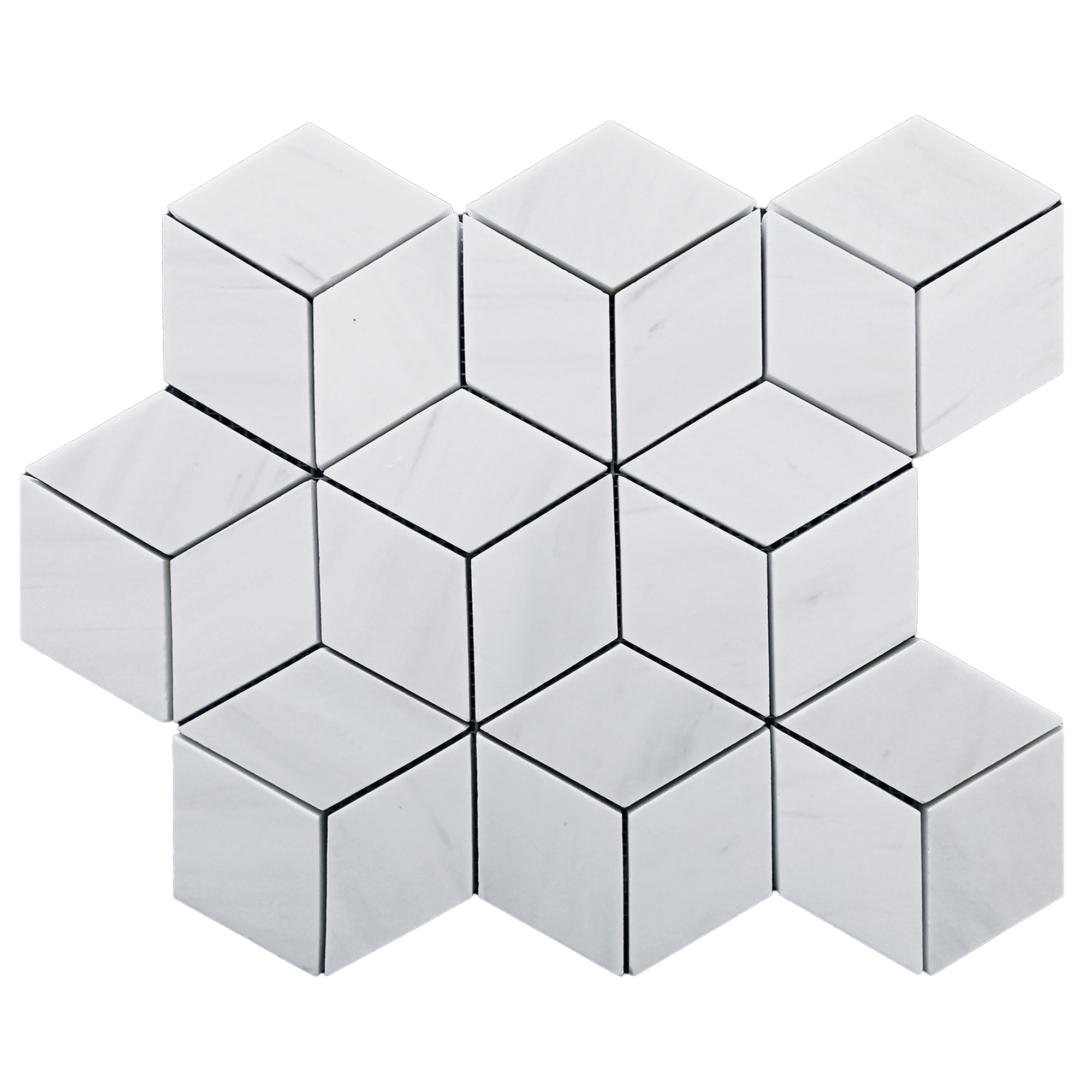 Bianco Dolomite Marble Rhombus 3D Cube Diamond Mosaic Tiles available in Honed and Polished finishes. Uses include Kitchen Backsplash, Bathroom Wall, Floor Tiles, and Shower Mosaics. Sample Sale Price $4.95. First Quality Marble in Stock Ready to Ship. Free shipping continental USA. The same Day In-Store Pickup is available. Visit our showrooms for complimentary design ideas. Rhombus 3D mosaic is a tile perfect for both residential and commercial projects. Rhombus 3D Patterned Mosaic Tiles are mainly preferred as floor tiles for their clean and aesthetic qualities. A large selection of coordinating products are available, including Bianco Dolomite basketweave mosaics, Bianco Dolomite chevron mosaics, Bianco Dolomite hexagon mosaics, 3x6 marble subway tiles, 12x12 Bianco Dolomite marble tiles, 4x4 Bianco Dolomite marble tiles, Bianco Dolomite Borders, Bianco Dolomite moldings and Bianco Dolomite Baseboards.