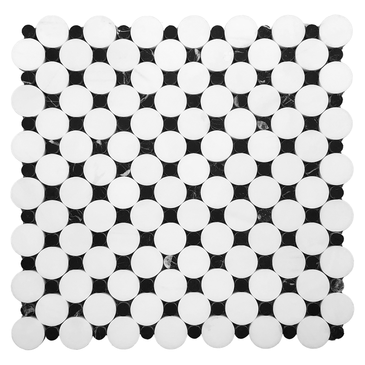 Bianco Dolomite Marble Penny Circles Mosaic Tile with Nero Marquina Black Circles Honed