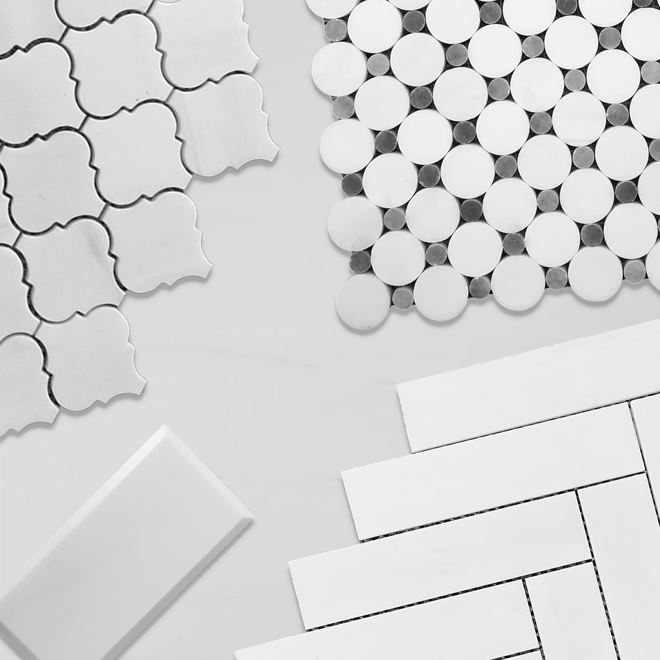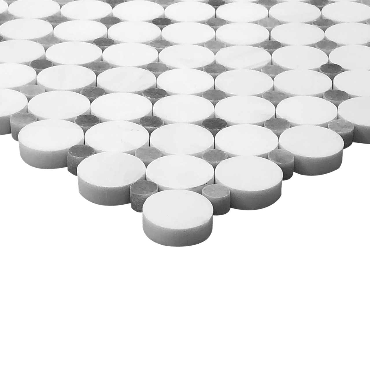 Bianco Dolomite Marble Penny Circles Mosaic Tile also known as white dolomite penny round circles Mosaic with bardiglio gray circles. Available in polished finish, premium grade penny circles mosaic tile perfect for both residential and commercial projects. Round Circles Mosaic Tiles mainly preffered as floor tiles for its clean, aesthetic qualities. A large selection of coordinating products are available and includes hexagon mosaics, 3x6 marble subway tiles, borders, moldings and baseboards.
