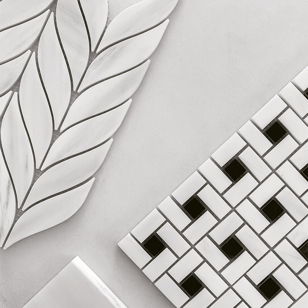 Bianco Dolomite Leaf Shape Mosaic Tile also known as Dolomiti White Leaf Shape Mosaic Marble. Available in honed, polished finishes. Premium grade (feather) Leaf mosaic tile perfect for both residential and commercial projects. (leaf) Grand Feather Mosaic Tiles mainly preffered as floor tiles for its clean, aesthetic qualities. A large selection of coordinating products are available and includes Bianco Dolomite basketweave mosaics, Bianco Dolomite herringbone mosaics, Bianco Dolomite hexagon mosaics, 3x6 marble subway tiles, 12x12 Bianco Dolomite marble tiles, 4x4 Bianco Dolomite marble tiles, Bianco Dolomite Borders, Bianco Dolomite moldings and Bianco Dolomite Baseboards.