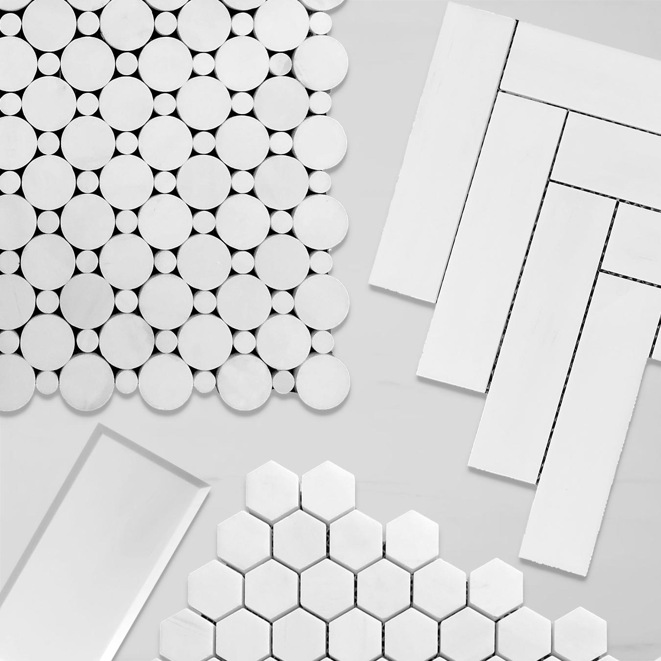 Bianco Dolomite Marble Penny Circles Mosaic Tile also known as white dolomite penny round circles Mosaic with bianco dolomite dots. Available in polished finish, premium grade penny circles mosaic tile perfect for both residential and commercial projects. Round Circles Mosaic Tiles mainly preffered as floor tiles for its clean, aesthetic qualities. A large selection of coordinating products are available and includes hexagon mosaics, 3x6 marble subway tiles, borders, moldings and baseboards.