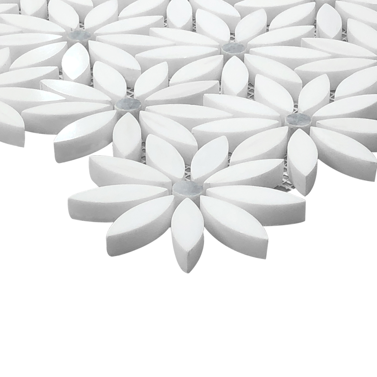 Bianco Dolomite Daisy Flower Waterjet Mosaic Tile also known as Dolomiti White Flower Waterjet Mosaic Marble. Available in honed, polished finishes. Premium grade (daisy) flower mosaic tile perfect for both residential and commercial projects. (flower) daisy Mosaic Tiles mainly preffered as floor tiles for its clean, aesthetic qualities. A large selection of coordinating products are available and includes Bianco Dolomite basketweave mosaics, Bianco Dolomite herringbone mosaics, Bianco Dolomite hexagon mosaics, 3x6 marble subway tiles, 12x12 Bianco Dolomite marble tiles, 4x4 Bianco Dolomite marble tiles, Bianco Dolomite Borders, Bianco Dolomite moldings and Bianco Dolomite Baseboards.