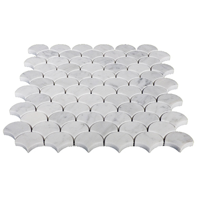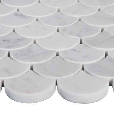 Carrara White Fish Scale Fan Shaped Mosaic Tile also known as Carrera Gold Fish Scale Fan Shaped Sea Shell Mosaic Marble. Available in honed, polished finishes. Premium grade (sea shell) Fish Scale mosaic tile perfect for both residential and commercial projects. (Fan shaped) Fish Scale Sea Shell Mosaic Tiles mainly preffered as floor tiles for its clean, aesthetic qualities. A large selection of coordinating products are available and includes Carrara White basketweave mosaics, Carrara herringbone mosaics, Carrara hexagon mosaics, 3x6 marble subway tiles, 12x12 Carrara marble tiles, 4x4 Carrara marble tiles, Carrara borders, Carrara moldings and Carrara baseboards.