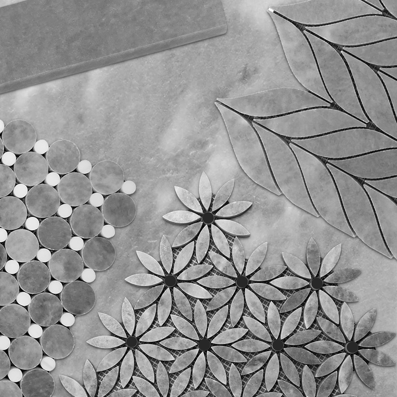 Bardiglio Gray Marble Daisy Flower Waterjet Mosaic Tile, available in polished and honed finishes, premium grade Bardiglio Gray Daisy Flower with Nero Marquina Black Center Accent Waterjet Mosaic Tile perfect for both residential and commercial projects. Daisy Flower Waterjet Mosaic Tiles are mainly preferred as floor tiles for its clean, aesthetic qualities. A large selection of coordinating products are available and includes Bardiglio Gray 2x4 subway mosaic tile, Bardiglio Gray 1" hexagon mosaic tile, Bardiglio Gray 2" hexagon mosaic tile, Bardiglio Gray herringbone mosaic tile, Bardiglio Gray bullnose pencil molding in honed and polished finishes.