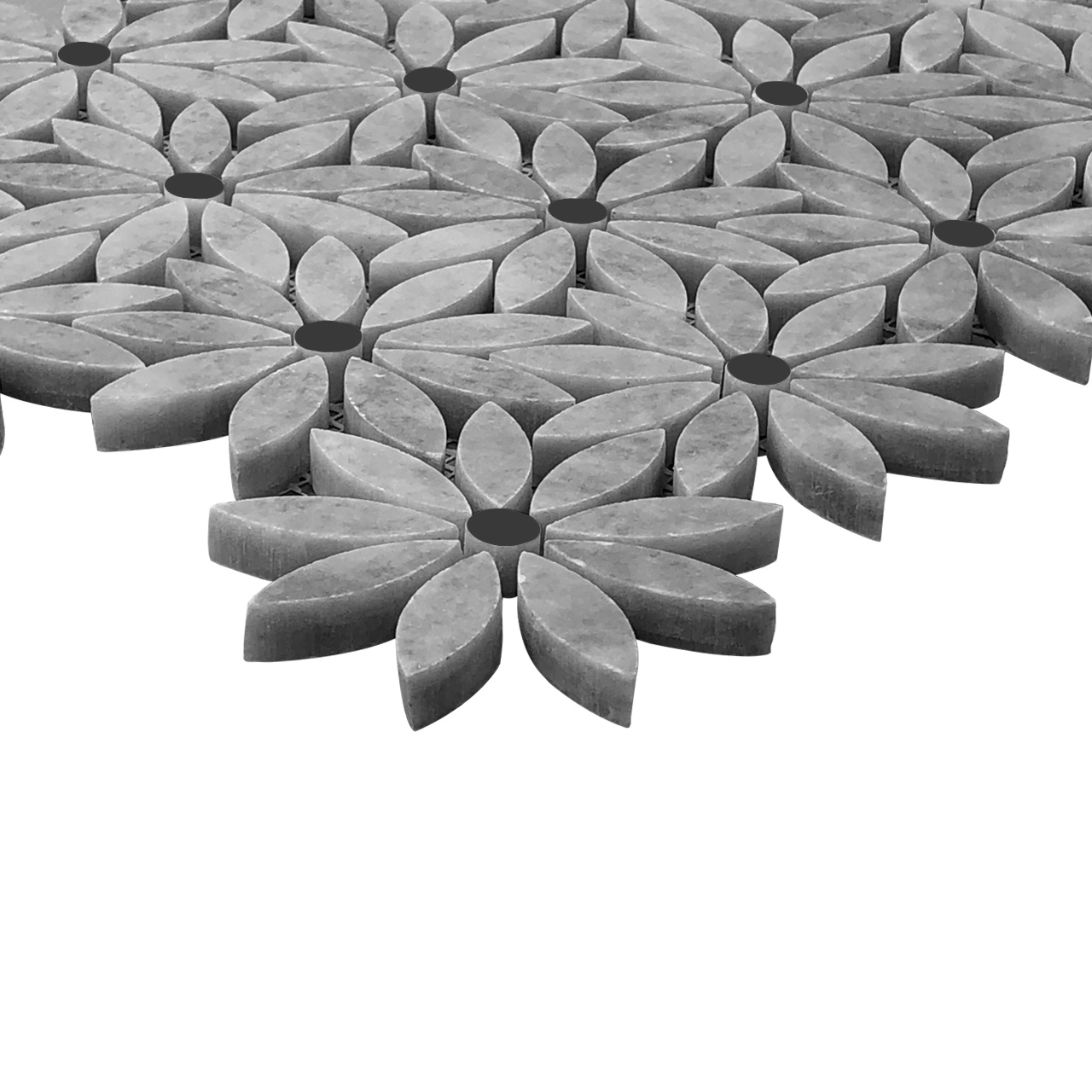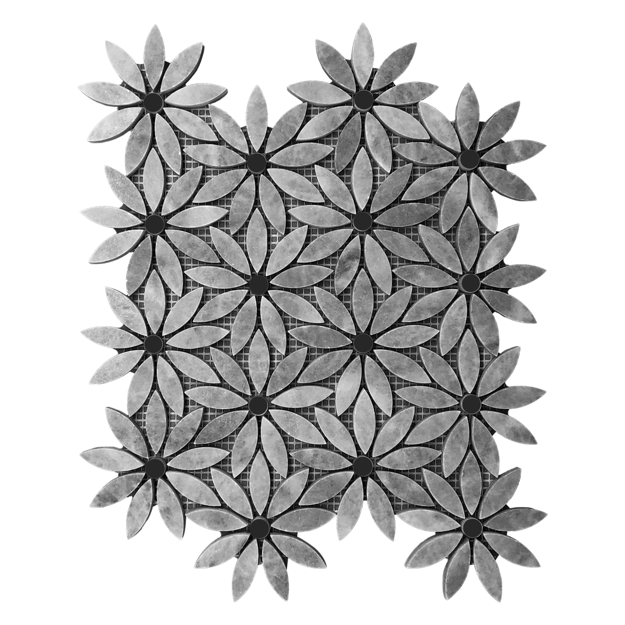 Bardiglio Gray Daisy Flower with Nero Marquina Black Center Accent Waterjet Mosaic Tile Matte Honed