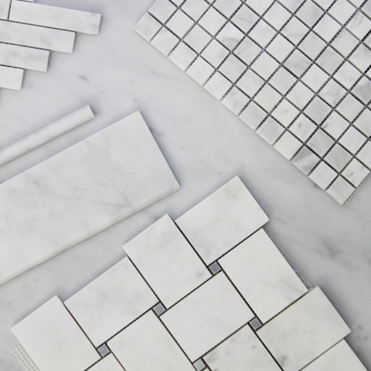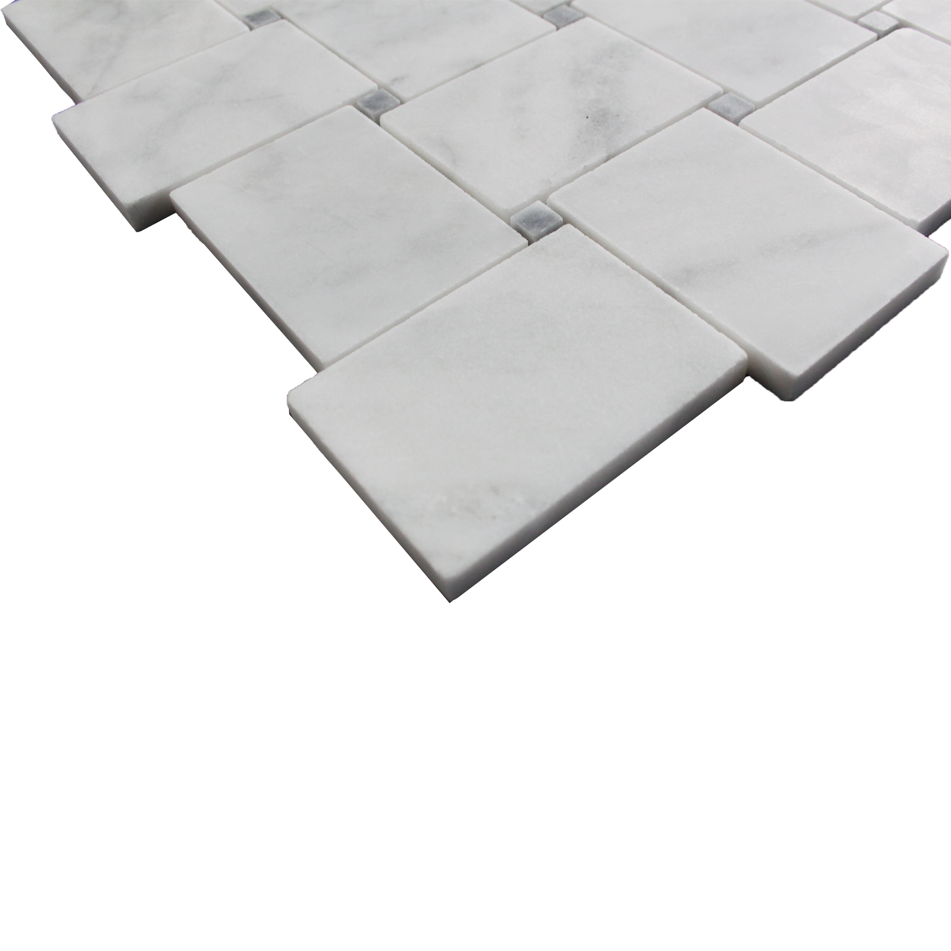 Bianco Carrara Large Basketweave Mosaic Tile also known as white carrera Large Basketweave Mosaic with bardiglio grey dots. Available in honed, polished and tumbled finishes, premium grade basketweave mosaic tile perfect for both residential and commercial projects. Basketweave Mosaic Tiles mainly preferred as floor tiles for its clean, aesthetic qualities. A large selection of coordinating products are available and includes hexagon mosaics, 3x6 marble subway tiles, borders, moldings and baseboards.