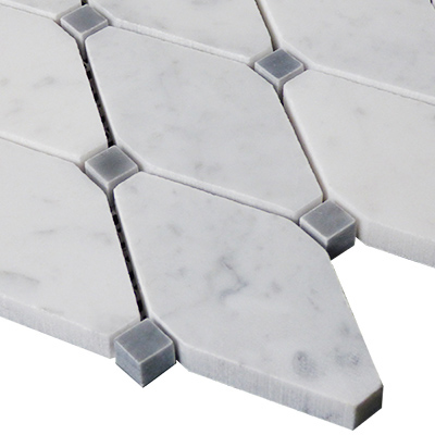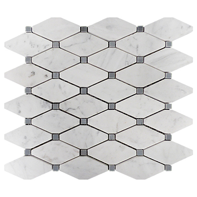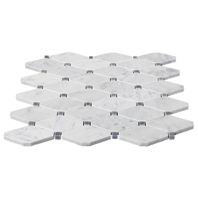 Bianco Carrara Long Octagon Mosaic Tile with Bardiglio Gray Dots Polished also known as White Carrera Rhomboid Long Octagon Mosaic Marble. Available in honed and polished finishes, premium grade Long Octagon mosaic tile perfect for both residential and commercial projects. Octagon Mosaic Tiles mainly preffered as floor tiles for its clean, aesthetic qualities. A large selection of coordinating products are available and includes Carrara basketweave mosaics, Carrara herringbone mosaics, Carrara hexagon mosaics, 3x6 marble subway tiles, 12x12 Carrara marble tiles, 4x4 Carrara marble tiles, Carrara borders, Carrara moldings and Carrara baseboards.