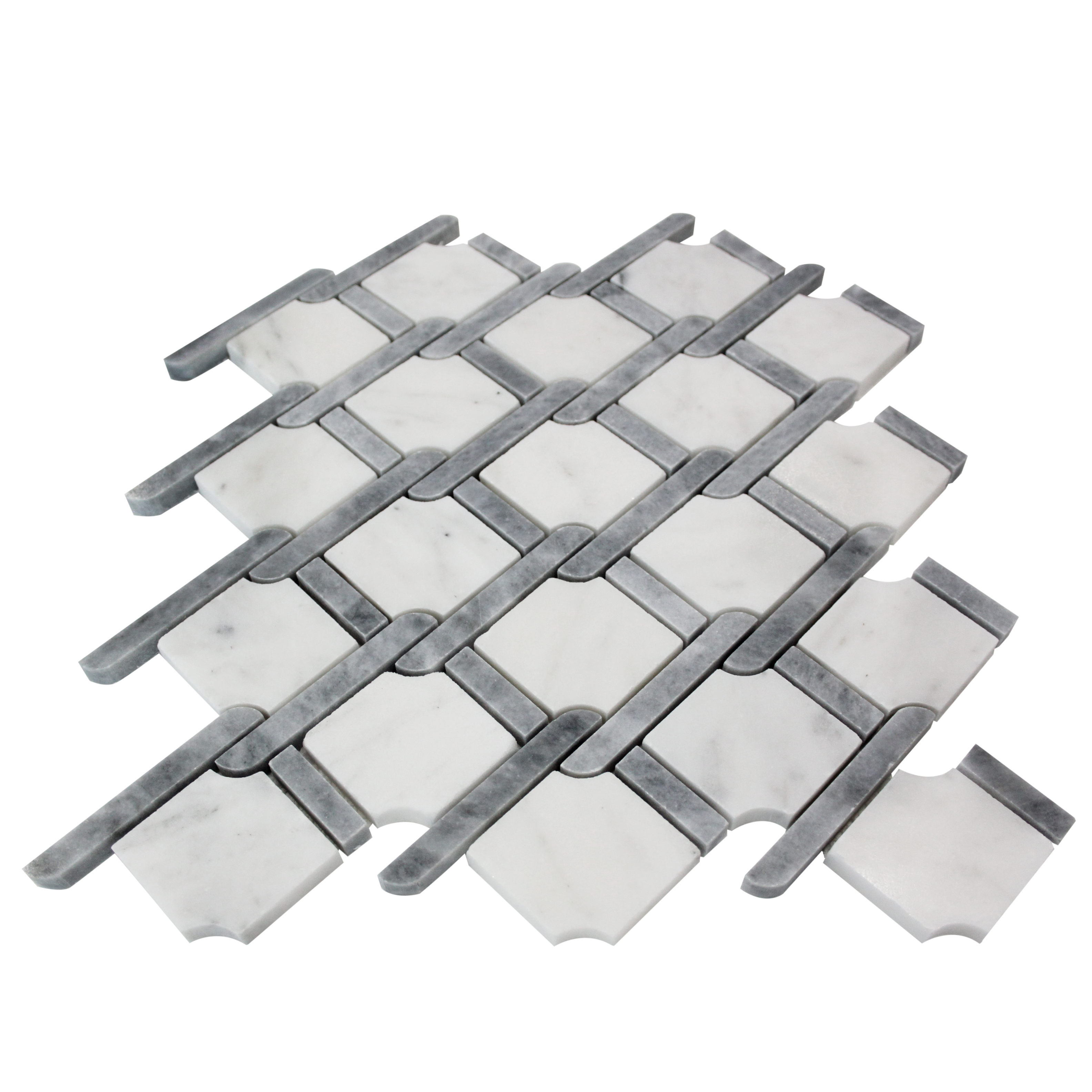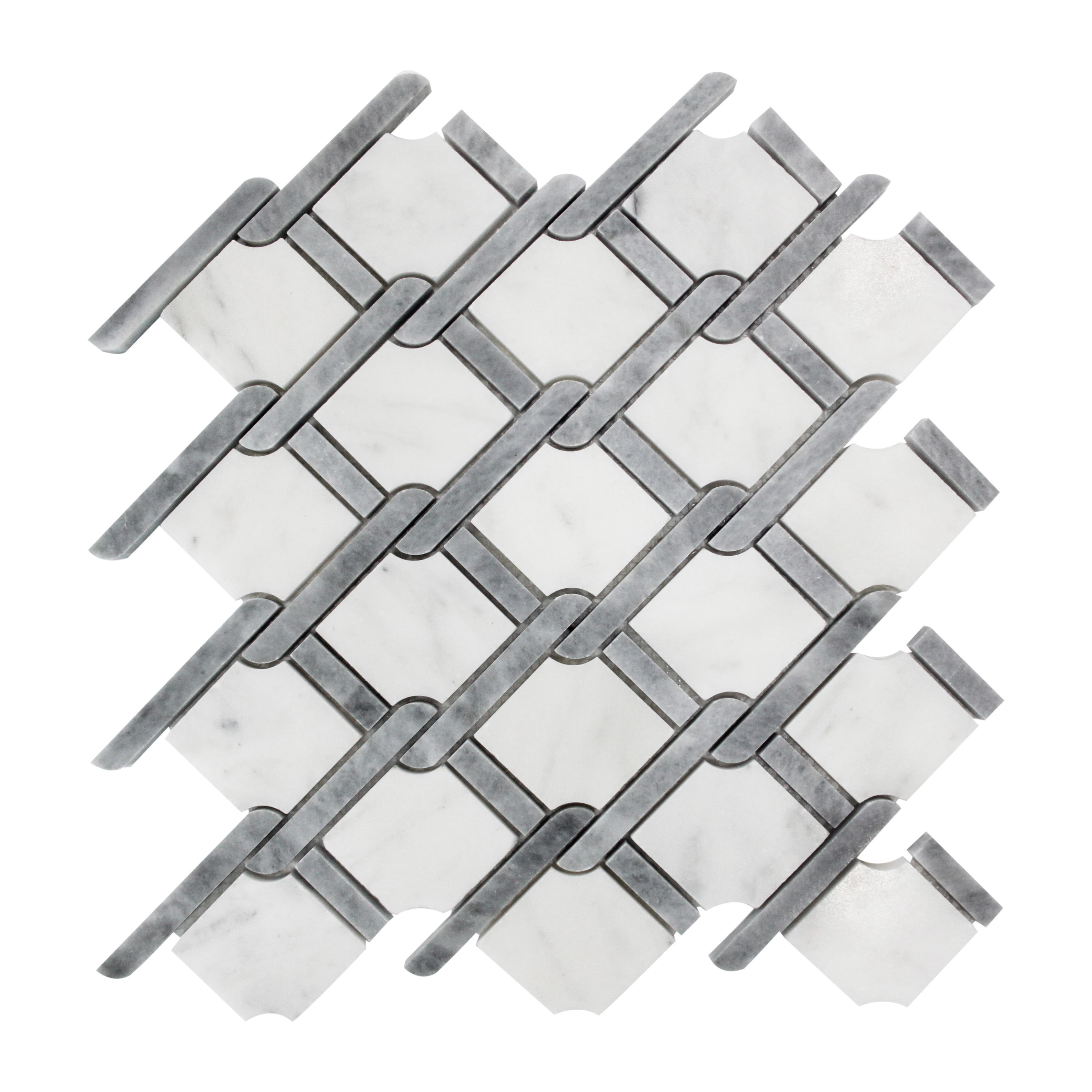 Carrara White Italian Marble Marbella Lynx Rope Design with Bardiglio Gray Strips Mosaic Tile Honed also known as white carrera Marble Marbella Lynx Rope Design with Bardiglio Gray Strips Mosaic. Available in honed, polished and tumbled finishes, premium grade mosaic tile perfect for both residential and commercial projects. Basketweave Mosaic Tiles mainly preferred as floor tiles for its clean, aesthetic qualities. A large selection of coordinating products are available and includes hexagon mosaics, 3x6 marble subway tiles, borders, moldings and baseboards.