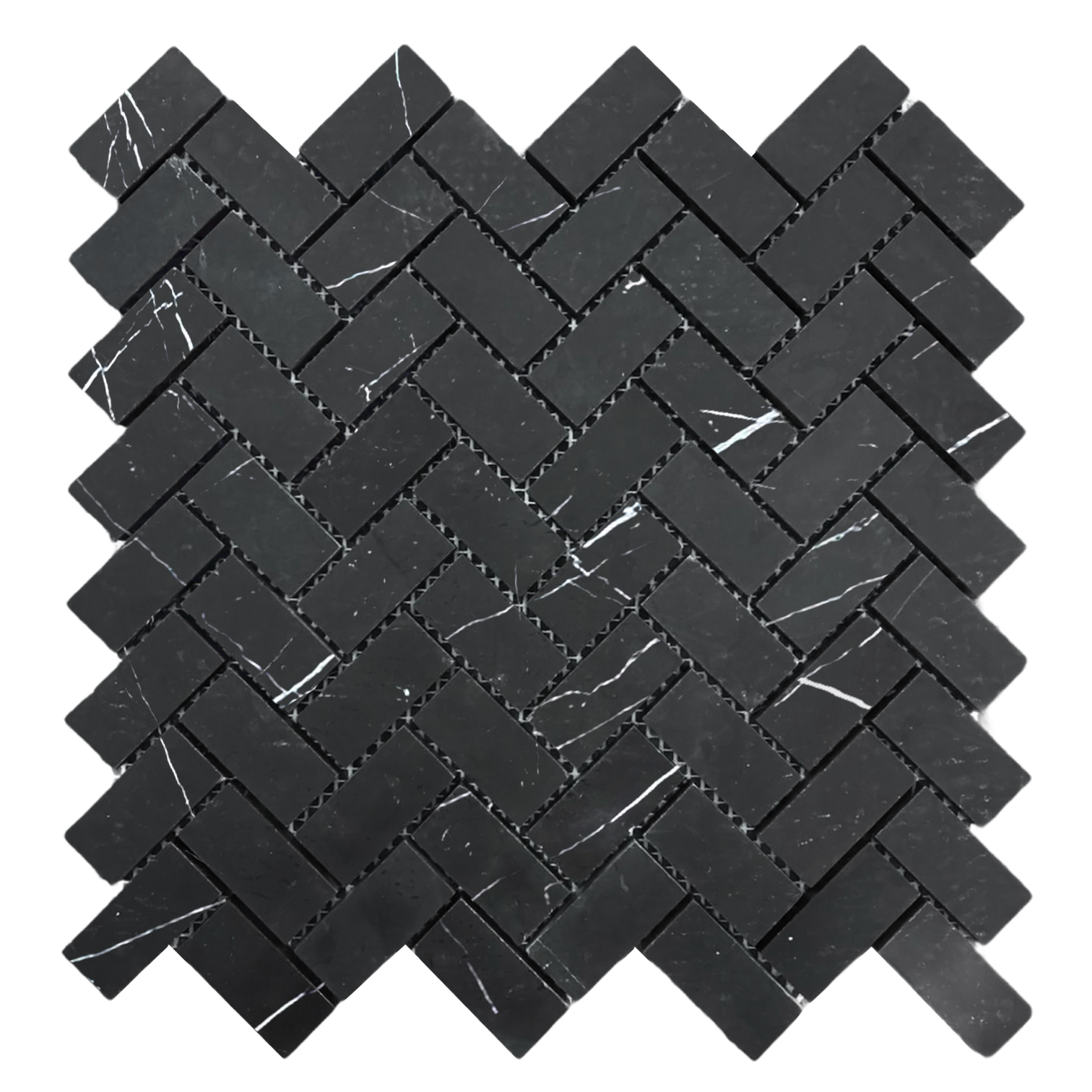 - 1" x 2" Herringbone Mosaic Tile Honed - Premium Grade Nero Marquina Black Marble