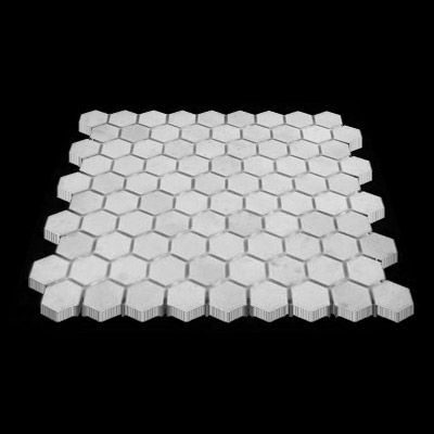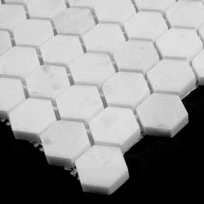 Bianco Statuario Hexagon Mosaic Tile also known as 1 1/4 inch White Statuary Hexagon Mosaic Marble. Available in honed, polished and tumbled finishes, premium grade Hexagon mosaic tile perfect for both residential and commercial projects. Hexagon Mosaic Tiles mainly preffered as floor tiles for its clean, aesthetic qualities. A large selection of coordinating products are available and includes Statuario basketweave mosaics, Statuario herringbone mosaics, 3x6 marble subway tiles, 12x12 Statuario marble tiles, 4x4 Statuario marble tiles, Statuario borders, Statuario moldings and Statuario baseboards.